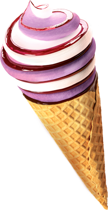 A refreshing dessert of vanilla and blackcurrant flavored ice cream, with blackcurrant topping, combined in a cone with chocolate coating.