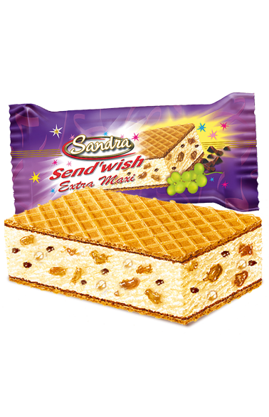 Two crunchy waffle sheets embrace a smooth vanilla flavored ice-cream, blended with chocolate drops and raisin.