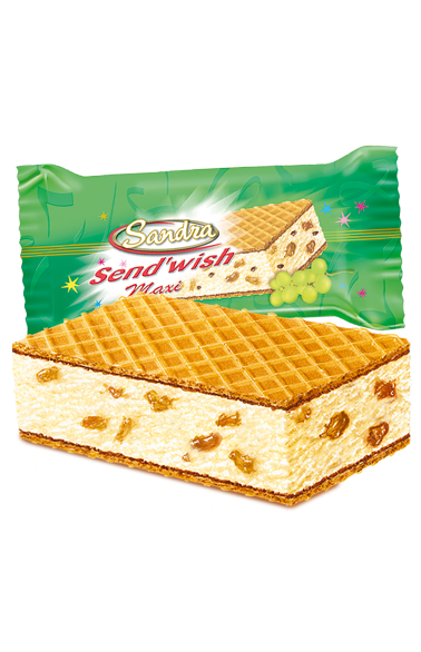 Smooth vanilla flavored ice-cream in a fine combination with raisin, is covered by two waffle sheets.