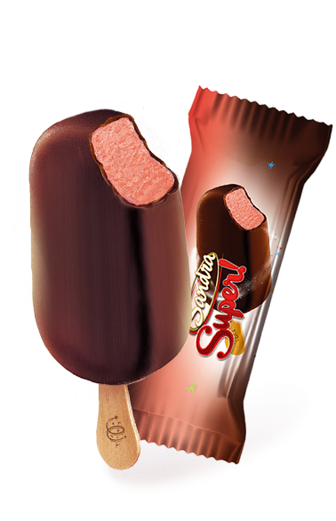 In a classical shape, of an ice-cream stick, where combined the most delicious ingredients that captivates with the harmony of the irresistible taste of the smooth chocolate ice-cream, chocolate topping and chocolate coverage with peanuts.