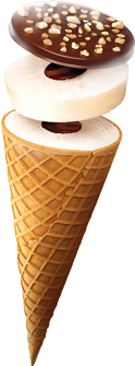 The finest vanilla flavored ice-cream is combined with rich chocolate toping, carefully placed in a wafer cone. The top is magically covered with crunchy chocolate coating, designed with nuts.