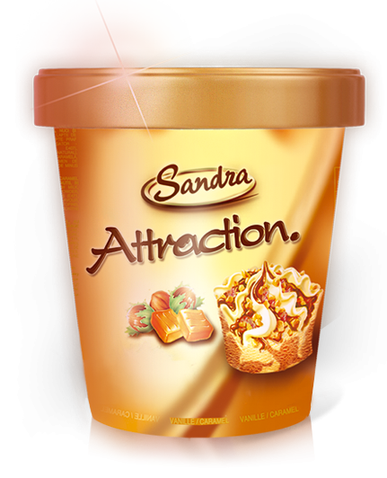 The Attraction for tempting caramel created an irresistible delight: vanilla and caramel flavored premium ice-cream swirled with caramel topping and chocolate coating. The precious finish for premium delight is the fine nuts decoration - surprisingly attractive!
