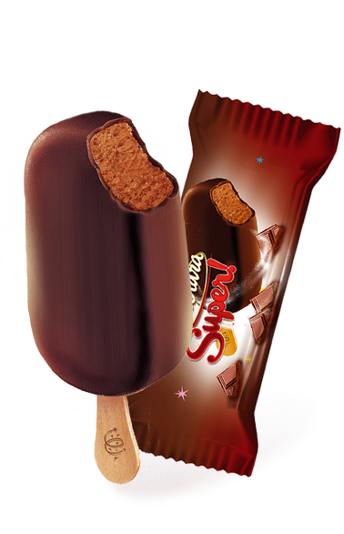 In a classical shape, of an ice-cream stick, where combined the most delicious ingredients that captivates with the harmony of the irresistible taste of the smooth chocolate ice-cream, chocolate topping and chocolate coverage with peanuts.